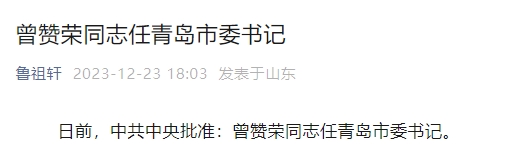 新京报讯 据鲁祖轩微信公众号消息,日前,中共中央批准:曾赞荣同志任青岛市委书记。