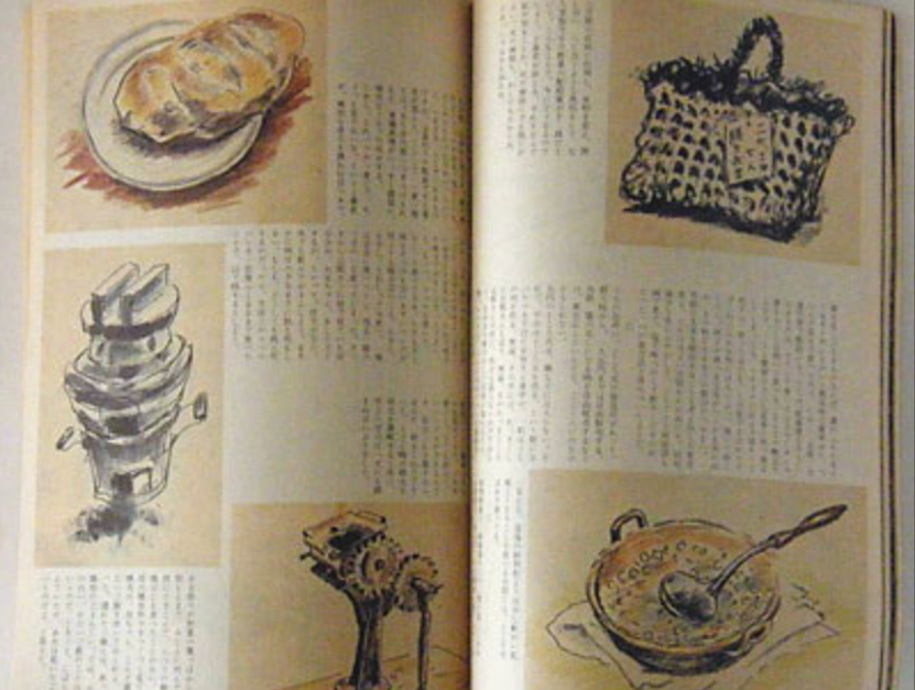花森还以另一种视角观察着这场残酷的现代战争带来的惨祸。《战争生活的记录》所收录的文章中,最令读者触目的可能就是在物资严重不足的情况下,民众互相争夺食物的相关内容。其中有的是1968年时投稿人对战争末期学童疏开的回忆,有的则是战时写下的生活记录。作为后者的代表,胜矢武男在《日日之歌》中,用出色的彩色铅笔画和简洁的感言对战时生活进行了记录。例如缝制防空头巾的妇人、捣糙米的孩童、配给品、发放给疏开学童的慰问品等。胜矢在战后也是一位颇有知名度的作家,出版过《太平洋物语》《魔海的悲剧》等面向少年读者的小说。