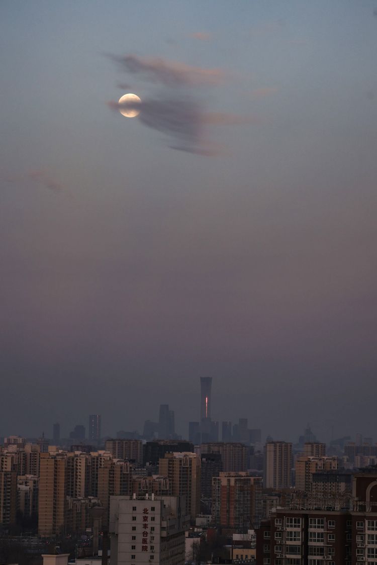 12月26日,月亮坠入云间,城市迎来夜晚。据北京市气象台预计,12月30日还有一波冷空气来袭,但影响不大,北京整体气温还处于波动回升当中,和常年相比略偏暖。