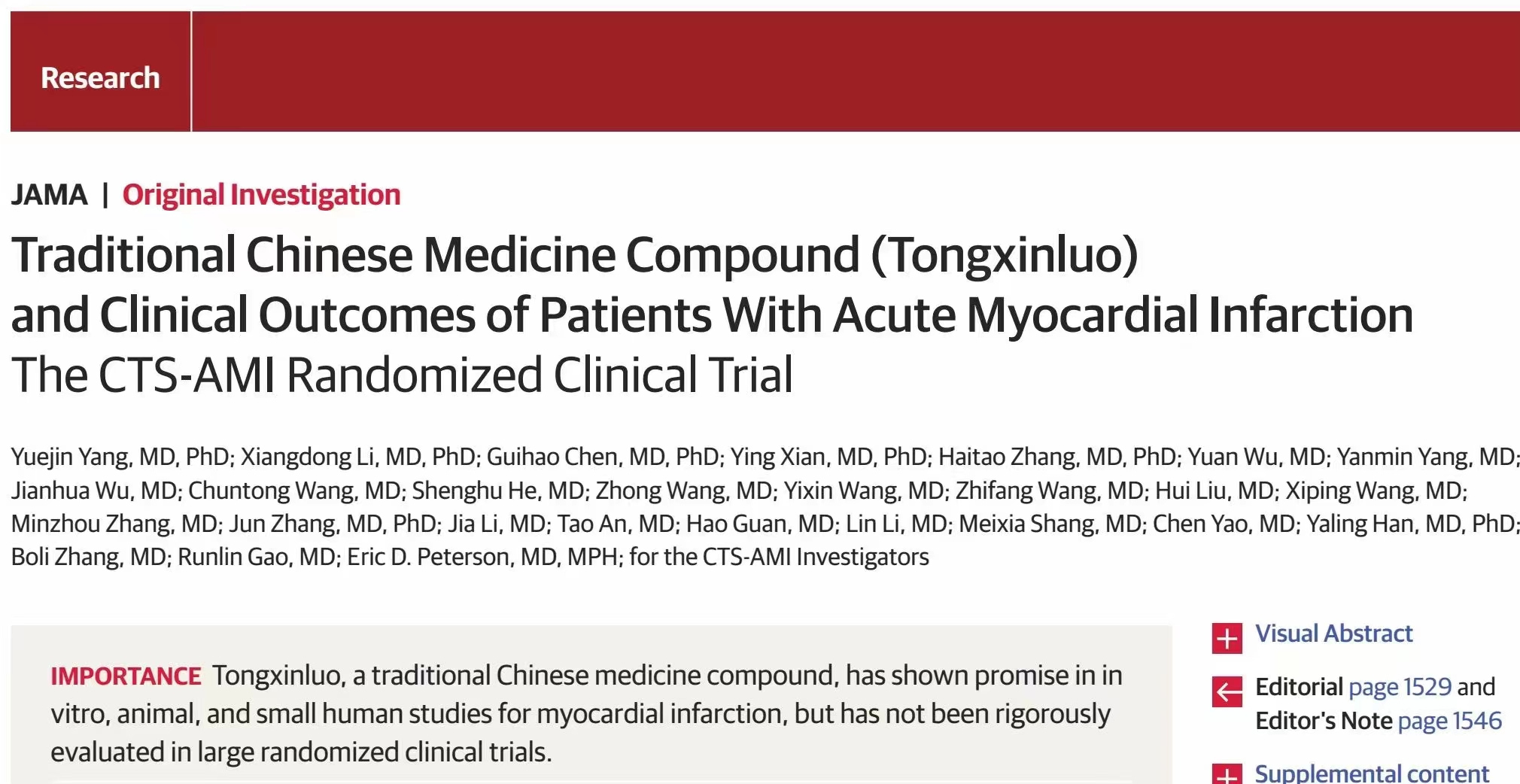 《中国通心络治疗急性心肌梗死的临床疗效——CTS-AMI随机临床研究》在《美国医学会杂志(JAMA)》发表。
