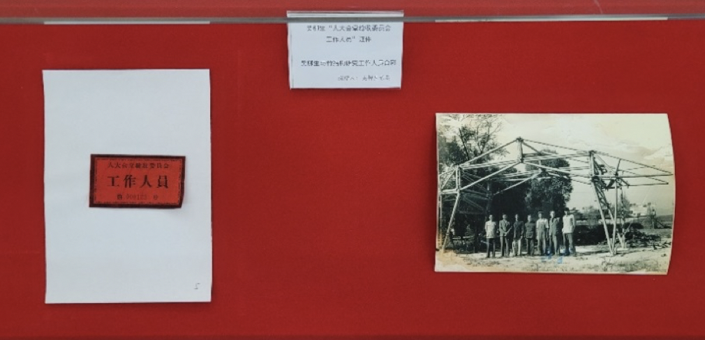 吴柳生1959年参加人民大会堂验收审查的工作人员证和从事竹结构研究时与工作人员合影的黑白照片。清华大学供图