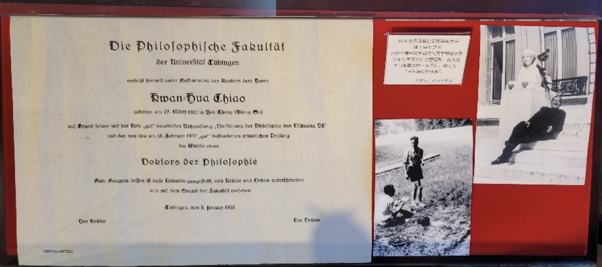 乔冠华获德国图宾根大学颁发的博士学位证书及其不同时期的照片。最右图为1974年在法国留影,此为他生前最喜欢的一幅照片,称之为“老年维特的欢笑”。清华大学供图
