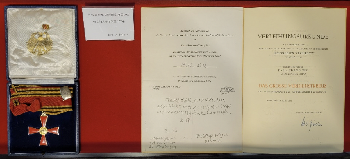 张维1988年荣获的联邦德国总统颁发的大十字勋章和证书。清华大学供图