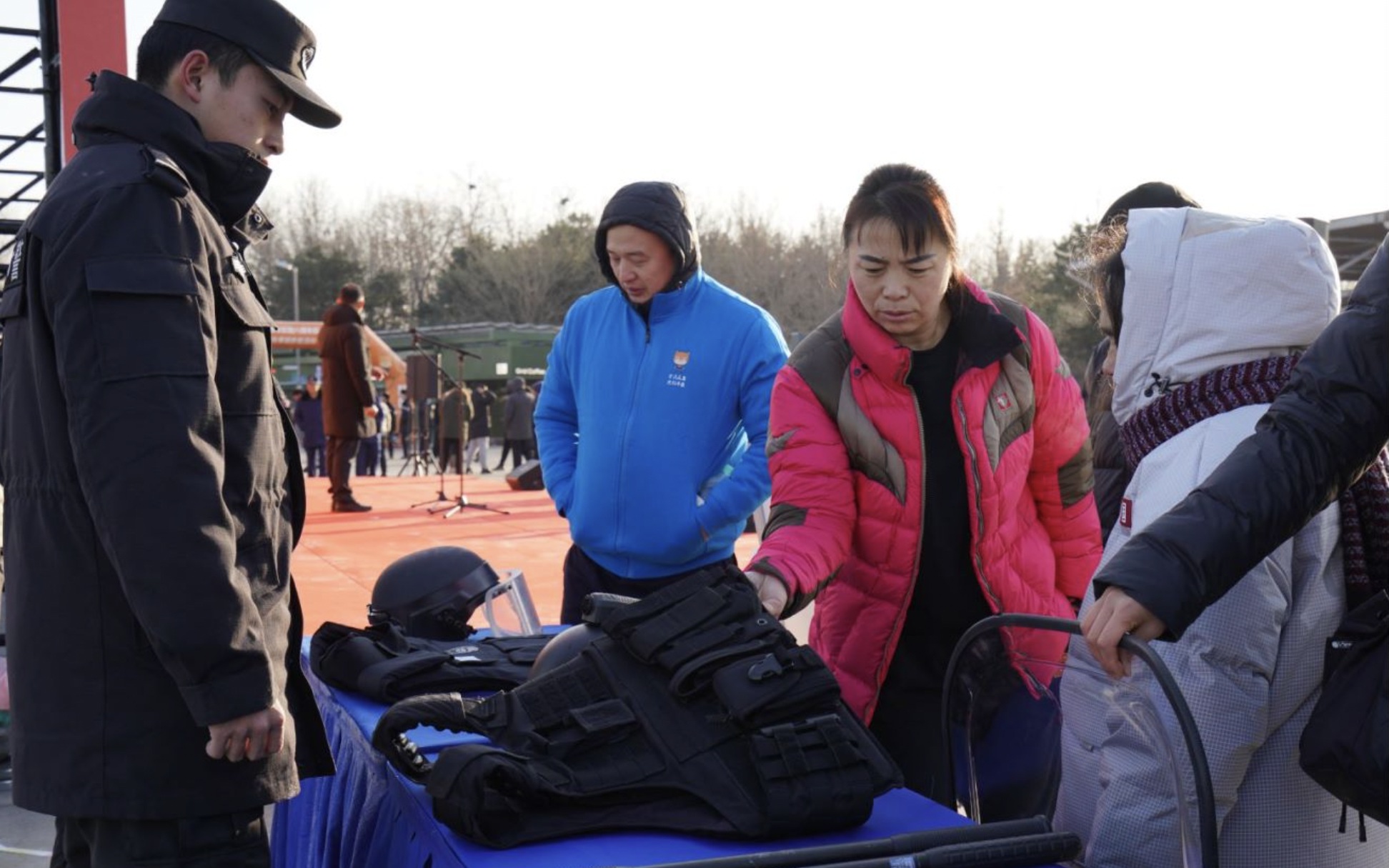 民警为现场群众讲解日常装备。图源:北京市公安局反恐怖和特警总队