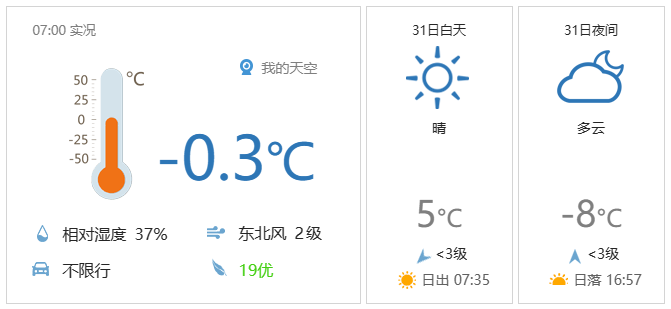 今天白天晴,北风三级、阵风五级转南风一级,最高气温5℃;夜间晴转多云,南转北风一二级,最低气温零下8℃。