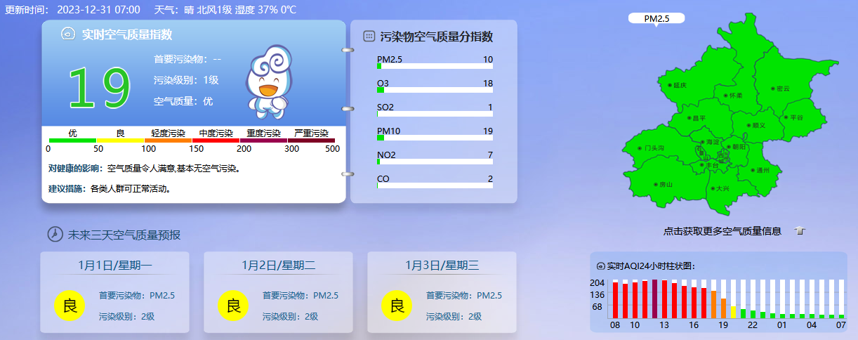 据北京市生态环境监测中心今早7时数据,目前实时空气质量指数19,空气质量优。