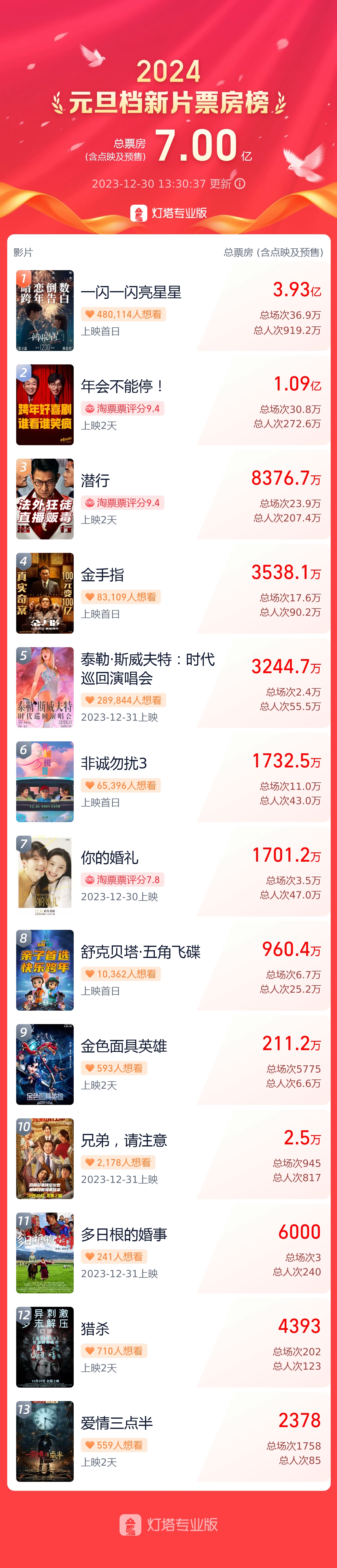 新京报讯(记者周慧晓婉)据灯塔专业版,截至12月30日13时30分,2024年元旦档新片总票房(含预售)突破7亿;截至12月30日13时13分,影片《年会不能停!》票房突破1亿。