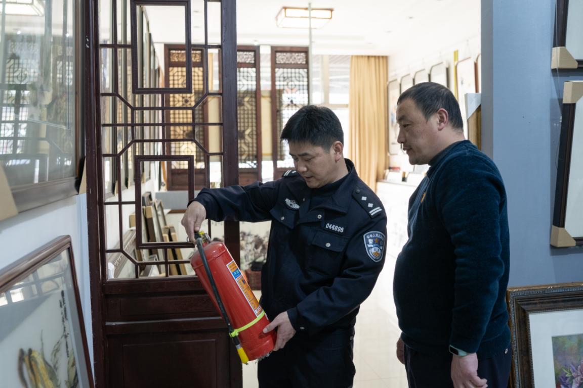 陈现志在辖区门店检查消防安全器材。图源:苏州警方