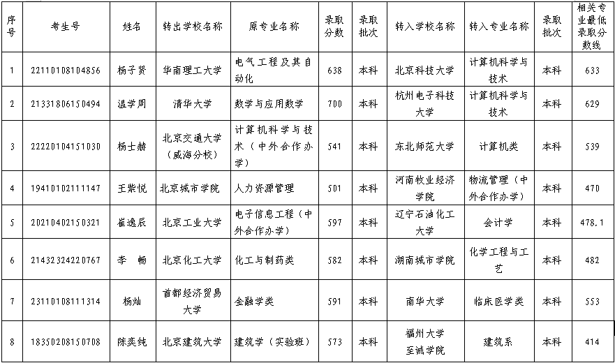 北京公示8名高校学生将跨省转学,涉清华、北工大、北建大等高校