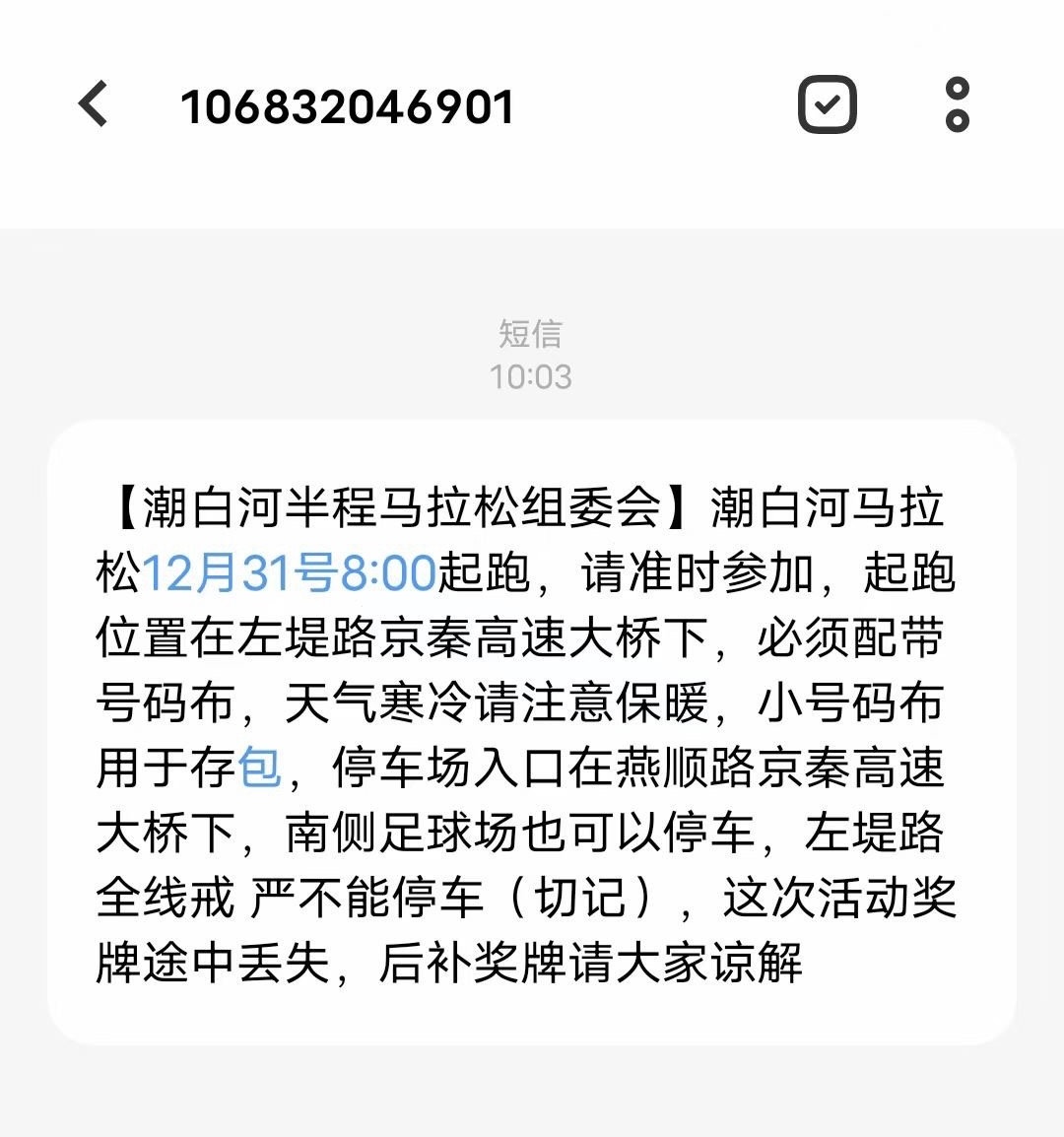2023年12月31日,2023潮白河半程马拉松在位于河北省三河市燕郊镇的潮白河左堤路开跑,约500名跑者参与其中。不过,该项比赛的部分奖牌在赛前意外丢失,并非所有跑者在赛后都领到了完赛奖牌。