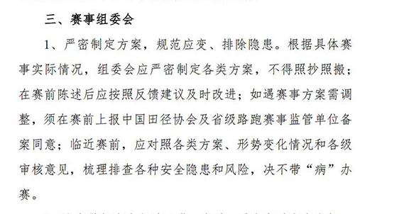去年10月,针对部分路跑赛事发生的竞赛组织问题,中国田协印发了《关于进一步加强全国路跑赛事竞赛组织工作的紧急通知》(以下简称《通知》),《通知》重申了赛事组委会、路跑赛事运营公司、省级监管单位的相关职责,要求各方应切实履行责任,确保赛事安全顺利进行。