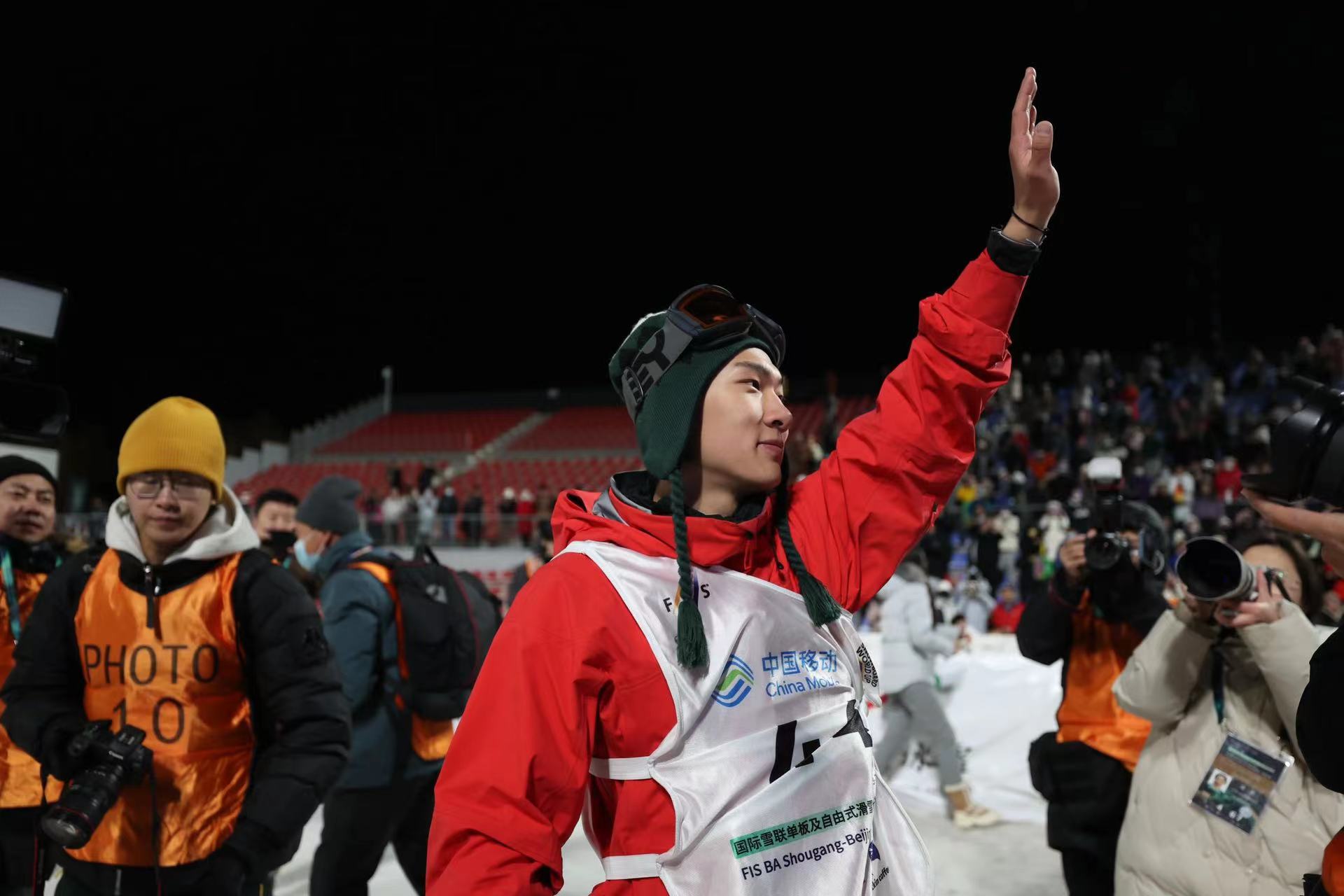 去年12月2日,国际雪联单板及自由式滑雪大跳台世界杯,苏翊鸣继北京冬奥会后再次在首钢大跳台收获冠军。 新京报记者 王飞 摄
