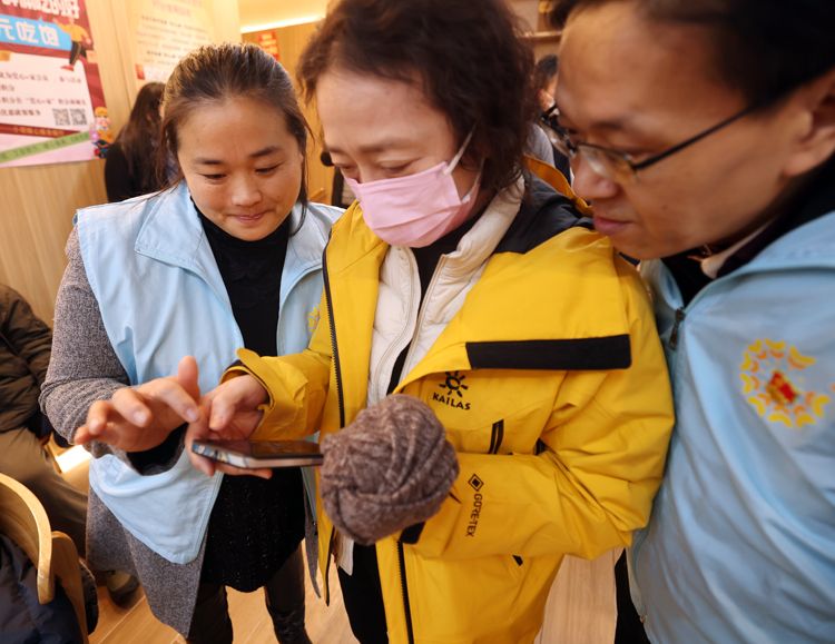 1月8日,志愿者帮助居民使用党心e家小程序。综合体细分为党建展示区、党建书籍阅读区、党员及党组织志愿服务区、社区食堂区、便民零售区、非遗销售区、非遗展示厅、综合便民服务区、积分兑换区、小哥暖心驿站十个功能模块。开业当天,在附近工作和生活的群众前来参观体验。