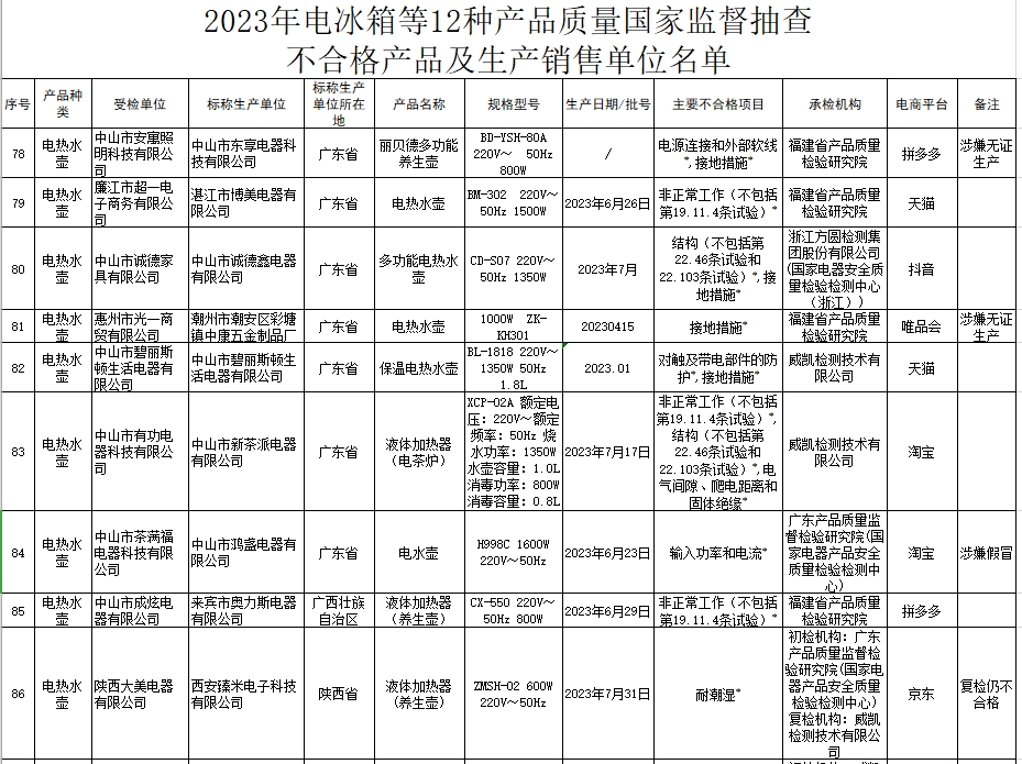 不合格名单显示,标称中山市东享电器科技有限公司生产的一批次丽贝德多功能养生壶(规格型号BD-YSH-80A 220V~50Hz 800W),主要不合格项目为“电源连接和外部软线、接地措施”,且涉嫌无证生产;标称潮州市潮安区彩塘镇中康五金制品厂生产的一批次电热水壶(规格型号1000W ZK-KH301;生产日期/批号20230415),主要不合格项目为“接地措施不合格”,且涉嫌无证生产;标称中山市鸿盏电器有限公司生产的一批次电水壶(规格型号H998C 1600W 220V~50Hz;生产日期/批号2023/6/23),主要不合格项目为“输入功率和电流不合格”,且涉嫌假冒;标称西安臻米电子科技有限公司生产的一批次液体加热器(养生壶)(规格型号ZMSH-02 600W 220V~50Hz;生产日期/批号2023年7月31日),主要不合格项目为“耐潮湿”,且复检仍不合格。