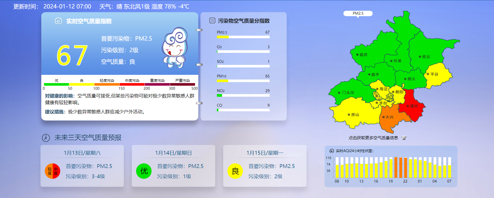 据北京市生态环境监测中心今早7时数据,目前实时空气质量指数67,首要污染物PM2.5,污染级别2级,空气质量良。