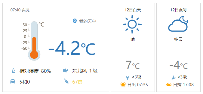 今天白天晴,北转南风二三级,最高气温7℃;夜间晴转多云,南转东风一二级,最低气温零下4℃。
