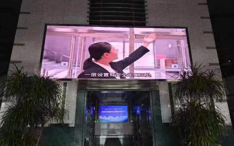 公共建筑内的大屏幕上播放着一分钟消防视频。图源:石景山区消防救援支队