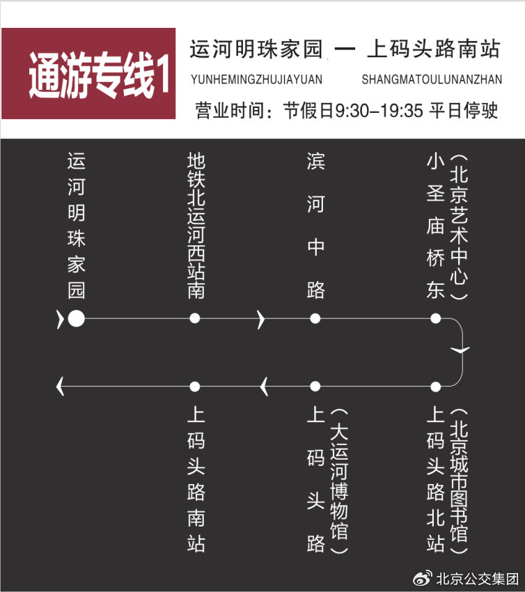 运营时间:运河明珠家园 节假日9:30-19:35,上码头路南站 节假日9:55-20:00;平日停驶