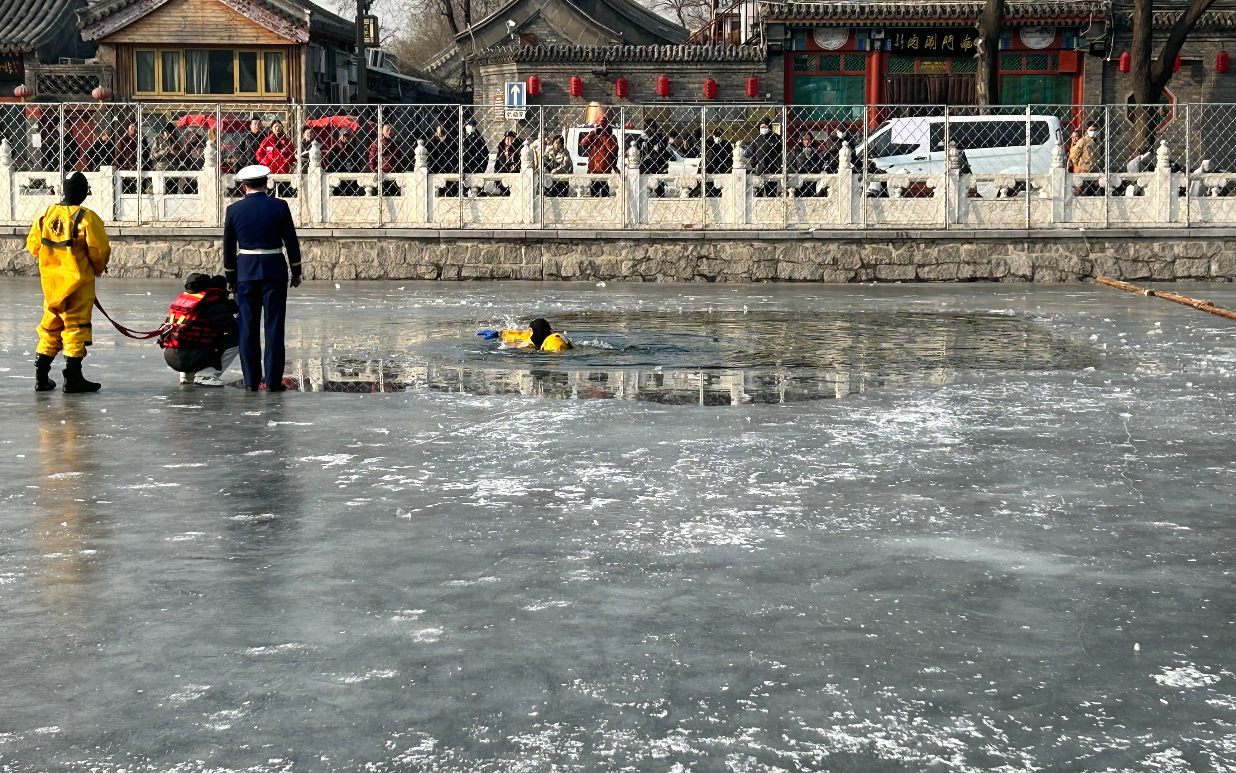 什刹海消防救援站站长高卓提示,如果景区工作人员、周边商户等发现有人落水,应该第一时间拨打119报警电话,然后就地取材,将绳索、救生圈、木杆等快速抛投给落水人员,等落水人员抓住这些器材后,岸上人员再将他们拖拽至安全区域。如果周围没有施救人员,落水者一定不要慌张,应保持冷静,否则反应越激烈,冰面破裂的速度越快,体力消耗也越大。然后,落水者踩水保持头部露出水面,靠近冰面边缘后,利用双肘确认冰面是否牢固,后腿不断地打水,利用向前的推力让上身趴在冰上。最后,全身呈俯卧姿势爬上冰面,移动到冰面后不要着急起身,可以连续翻滚直至安全区域。