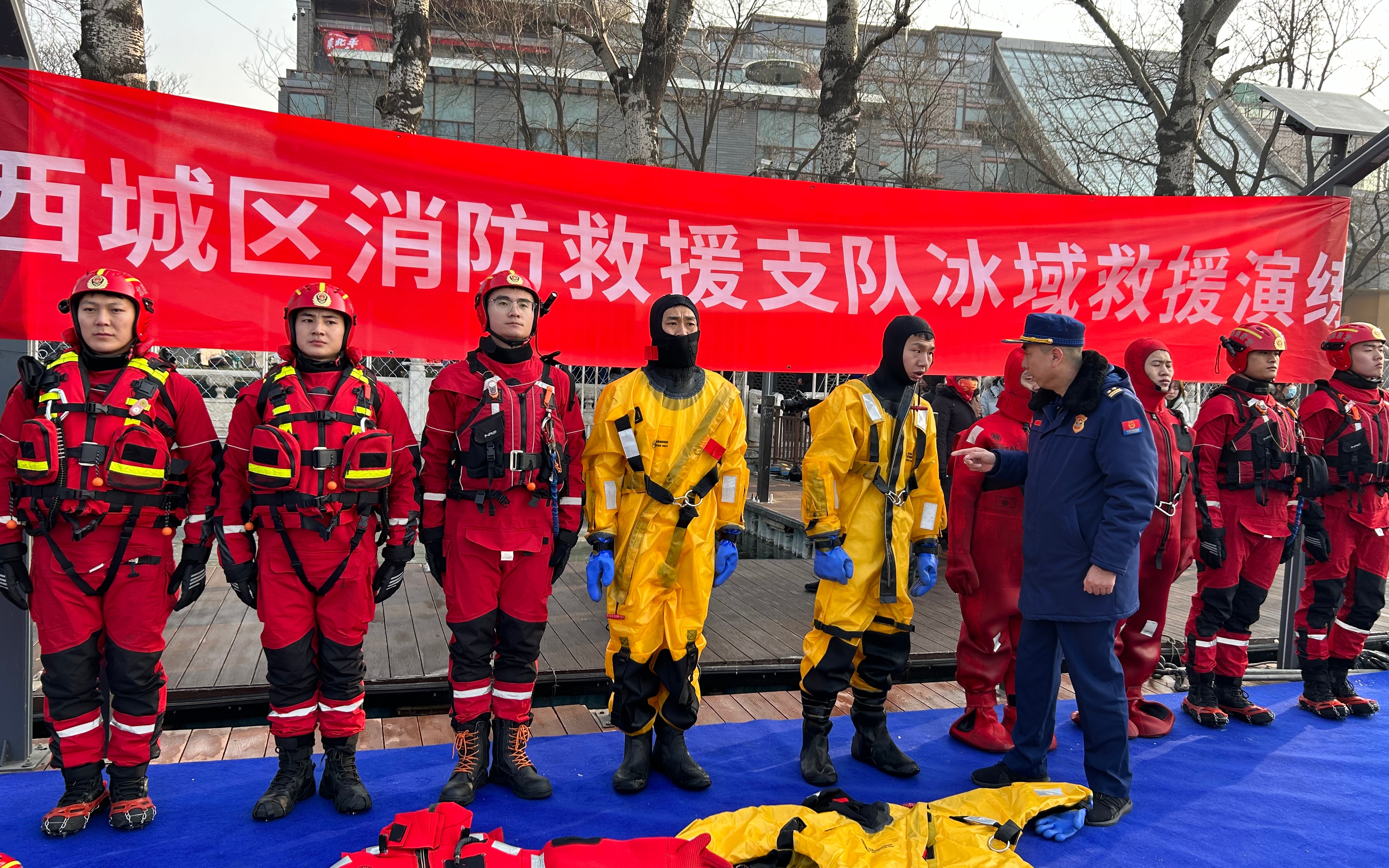 新京报记者在现场了解到,本次演练调集了西城区消防救援支队的水域救援专业队骨干力量,并结合近期突出冰域救援实战案例,分岗位、分环节、分步骤开展。最近气温回升,白天气温较高,有冰面较薄,甚至能看到不远处有未结冰的水域。演练假设冰面突然破裂后游客落水,消防救援人员经过对现场环境、被困者状况、救援能力的评估后,分别开展了直接救援、间接救援两种救援方式。