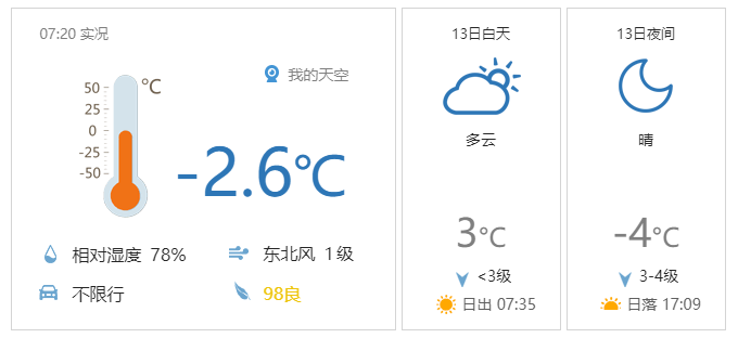 今天早晨有轻雾,白天多云间阴,西部、北部有零星小雪,东转北风二级,最高气温3℃;夜间多云转晴,北风二级转三四级,阵风六级左右,最低气温零下4℃。