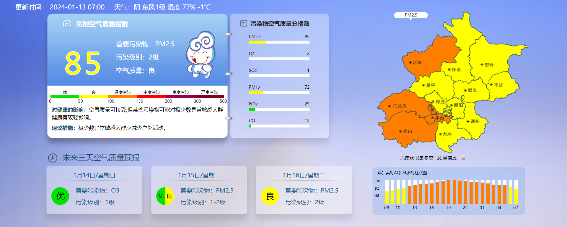 据北京市生态环境监测中心今早7时数据,目前实时空气质量指数85,首要污染物PM2.5,污染级别2级,空气质量良。