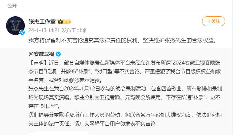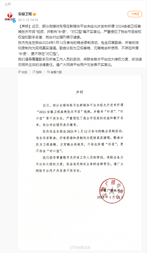 新京报讯 据@安徽卫视 消息,近日,部分自媒体账号在新媒体平台未经允许发布所谓“2024安徽卫视春晚张杰节目”视频,并散布“补录”、“对口型”等不实言论。严重侵犯了我台节目版权权益和歌手名誉,我台对此强烈表示谴责。