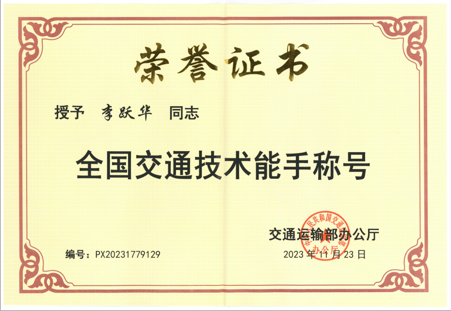 2023年11月,李跃华获评“全国交通技术能手”称号。受访者供图