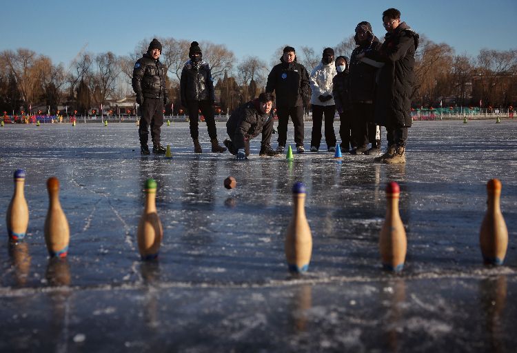 1月15日,什刹海冰场,选手们正在参加冰木射比赛。