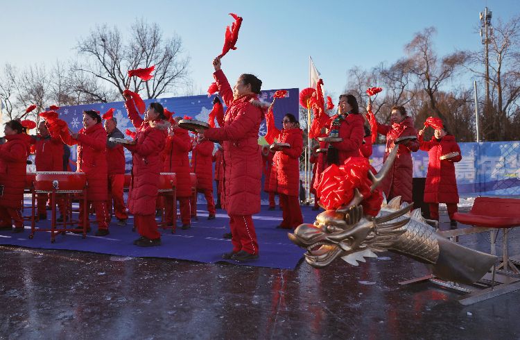 1月15日,锣鼓队为选手们加油鼓劲儿。