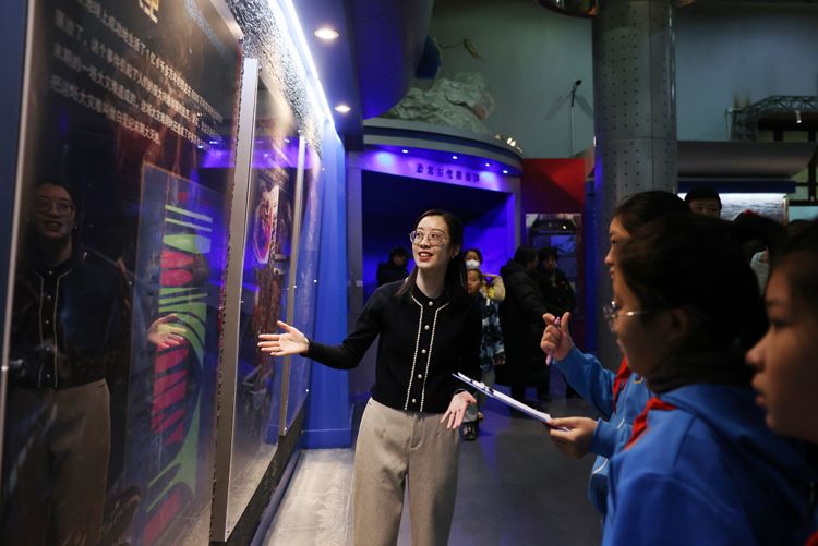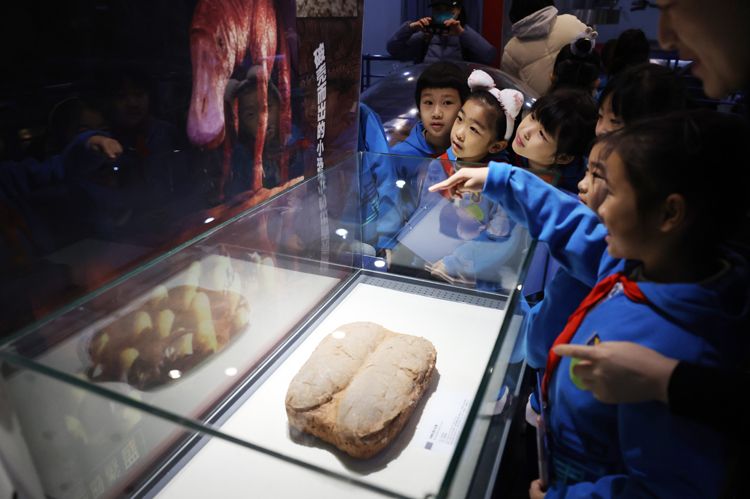 在国家自然博物馆“古爬行动物”展厅,史家胡同小学的师生进行《恐龙头骨化石上的洞洞》课程展示。