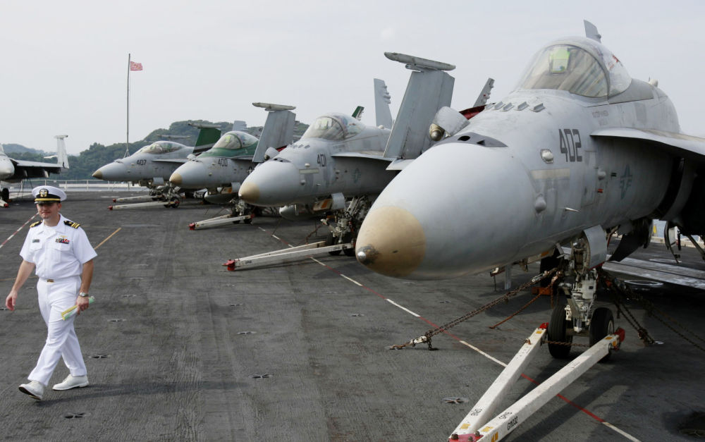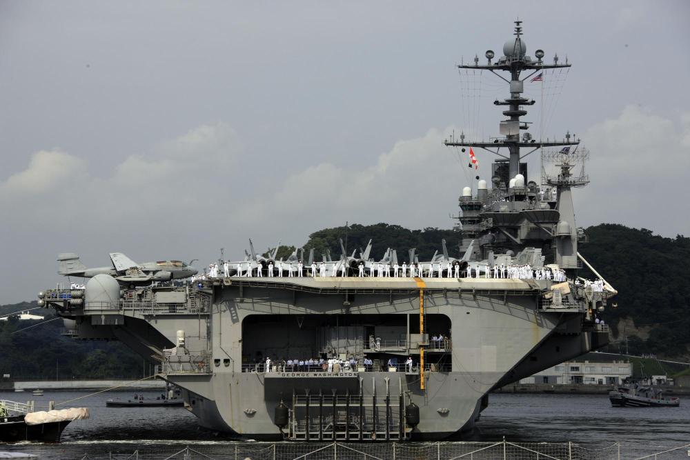 2008年9月25日,美国“乔治·华盛顿”号核动力航空母舰驶进日本横须贺美军基地。新华社记者任正来摄