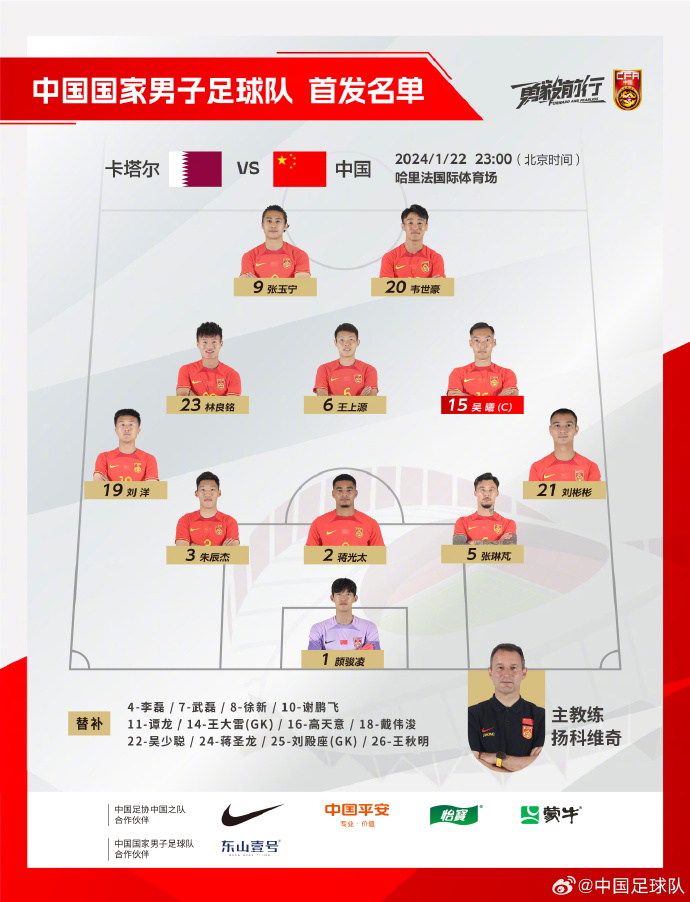 新京报讯 据中国足球队官博消息,小组赛第三场中国队对阵卡塔尔队,中国队精锐出击,为晋级亚洲杯十六强全力拼搏!