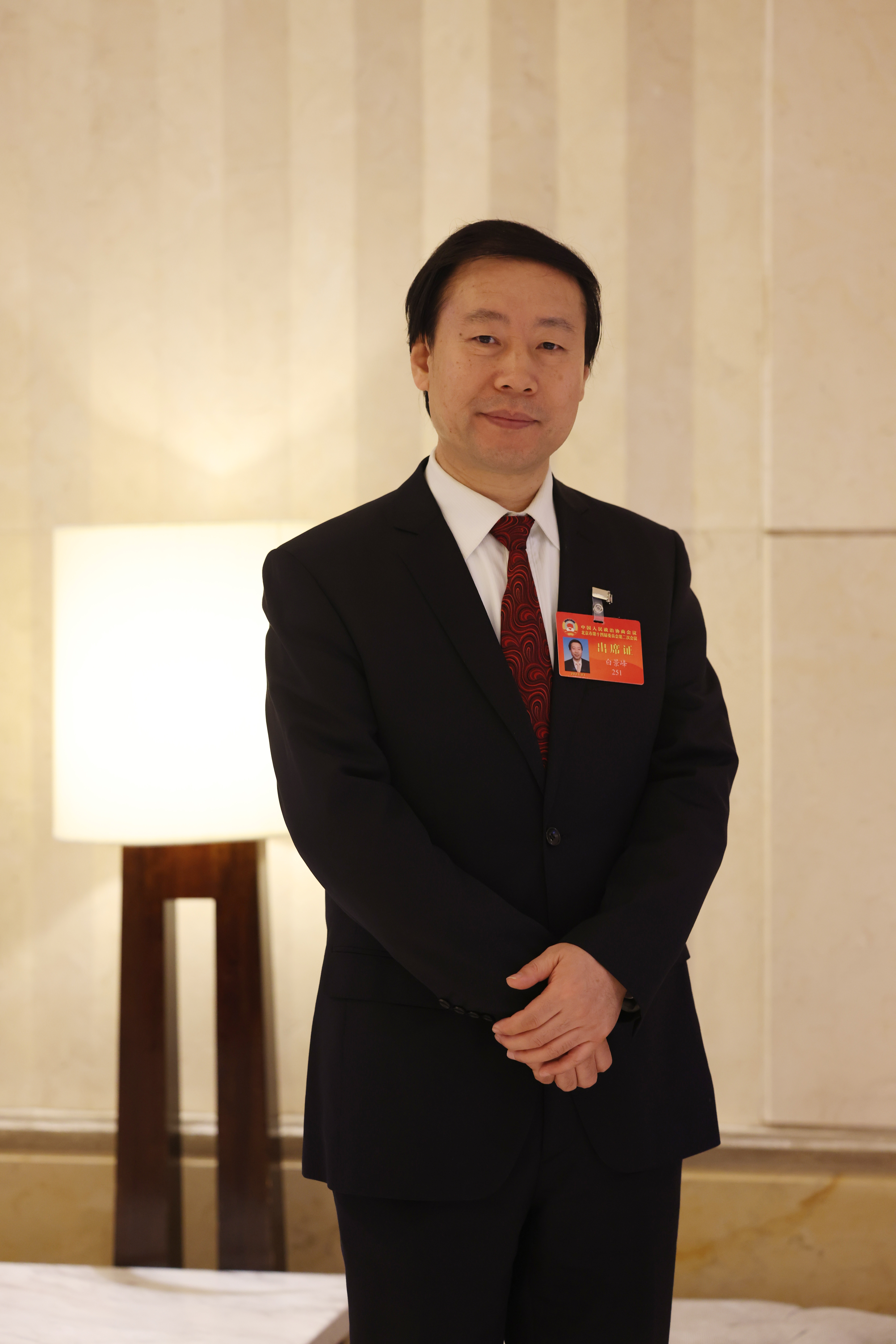 市政协委员白景峰在会议现场接受新京报记者采访。李木易 摄