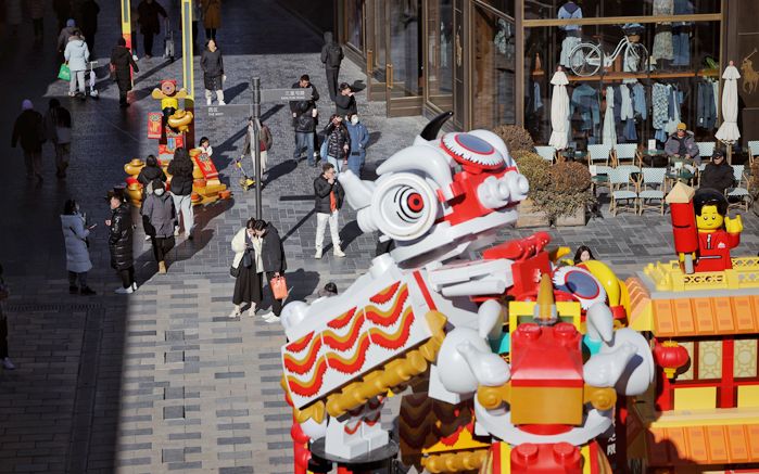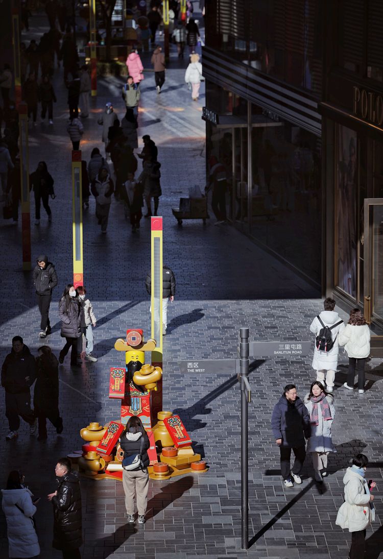 1月24日,天气晴好,气温回暖,市民在北京三里屯太古里逛街。春节临近,太古里商圈换上了喜庆的新春装饰,拼搭起舞龙舞狮表演、新春牌坊,新春氛围拉满。