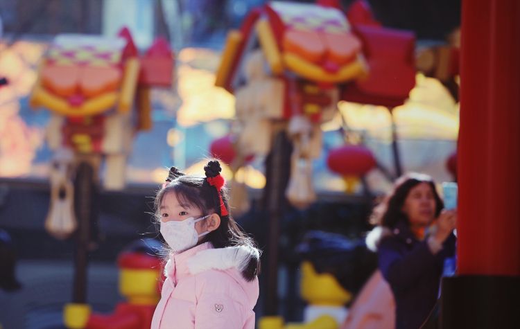 1月24日,三里屯太古里,小女孩梳起传统的中式双髻发型,扎着喜庆的红头绳。
