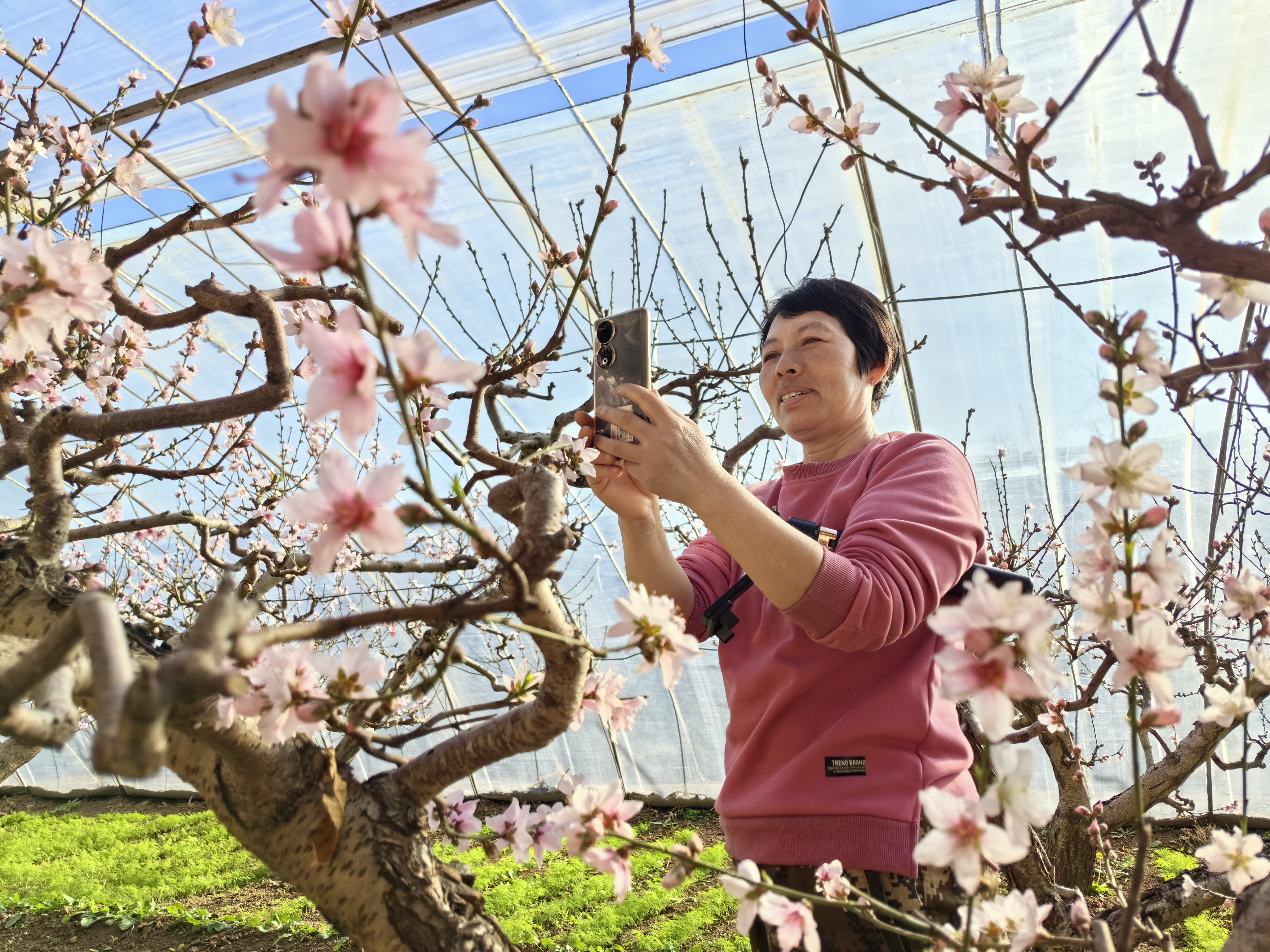 “这个大棚里种的是早熟蟠桃,种了260多棵,3月底4月初就成熟了,欢迎大家现在来这里赏桃花,在桃花节的时候到我们这儿大棚吃鲜桃。”陶大姐打开手机直播,与网友互动,邀请网友春节期间来平谷过大年。