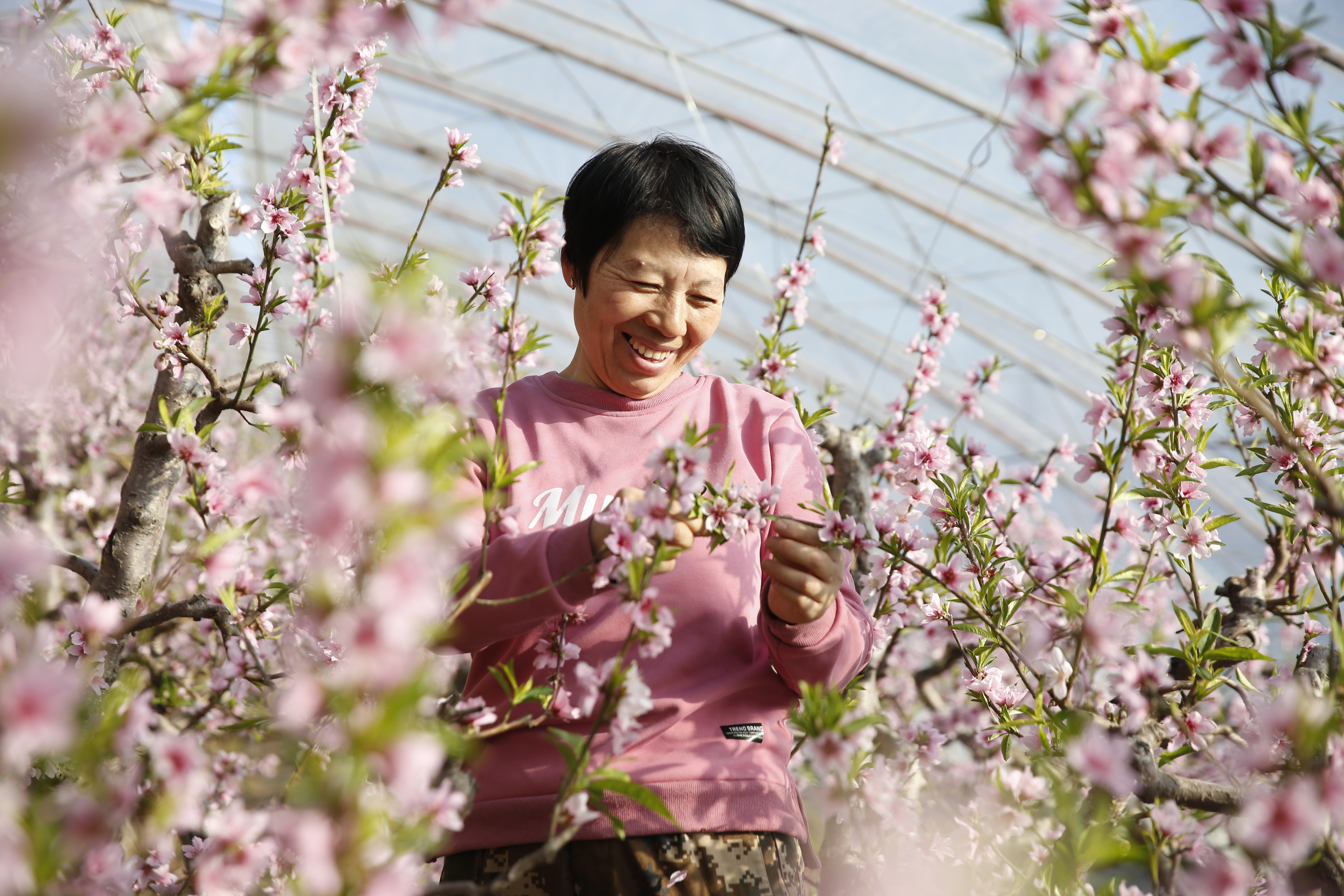 桃农在大棚里欣赏桃花。通讯员 马平川 摄