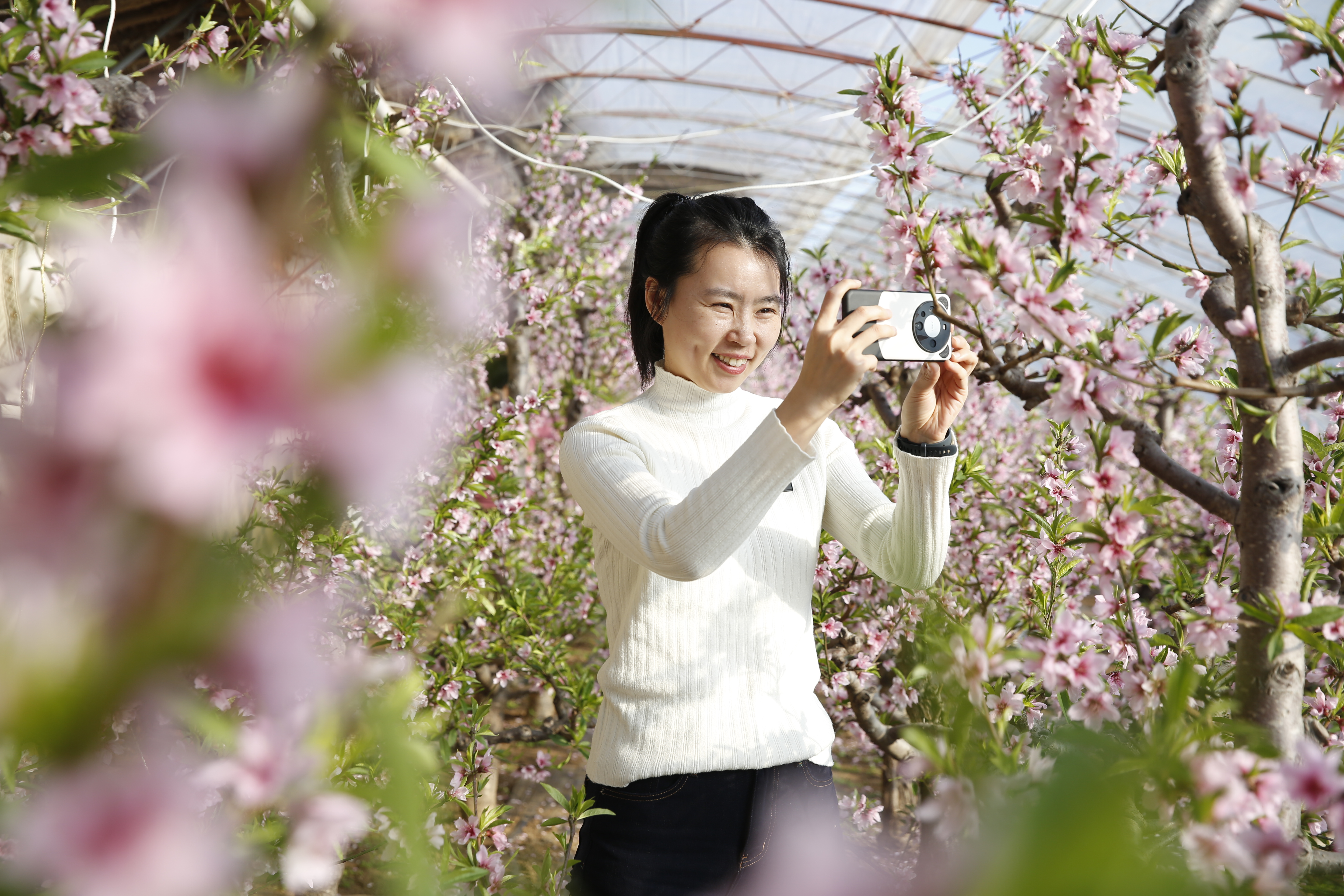 1月25日,记者走进峪口镇兴隆庄村的一栋桃花大棚内,数百棵桃树的桃花正竞相绽放,粉嫩的花瓣在阳光的照耀下显得格外娇艳。这些桃树采用了矮化密植技术,使得整个大棚看起来更加紧凑和精致。