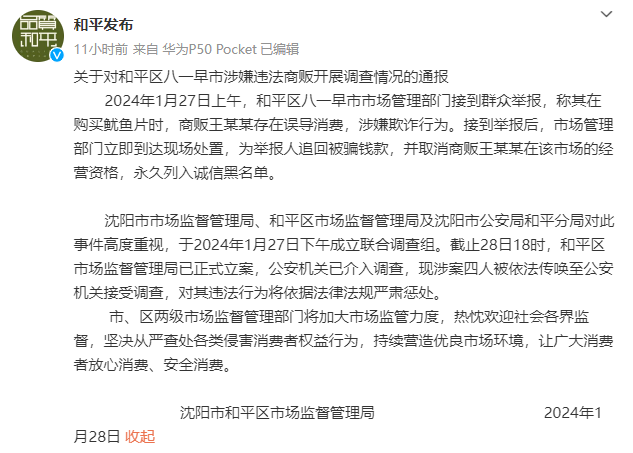 沈阳市市场监督管理局、和平区市场监督管理局及沈阳市公安局和平分局对此事件高度重视,于2024年1月27日下午成立联合调查组。截止28日18时,和平区市场监督管理局已正式立案,公安机关已介入调查,现涉案四人被依法传唤至公安机关接受调查,对其违法行为将依据法律法规严肃惩处。