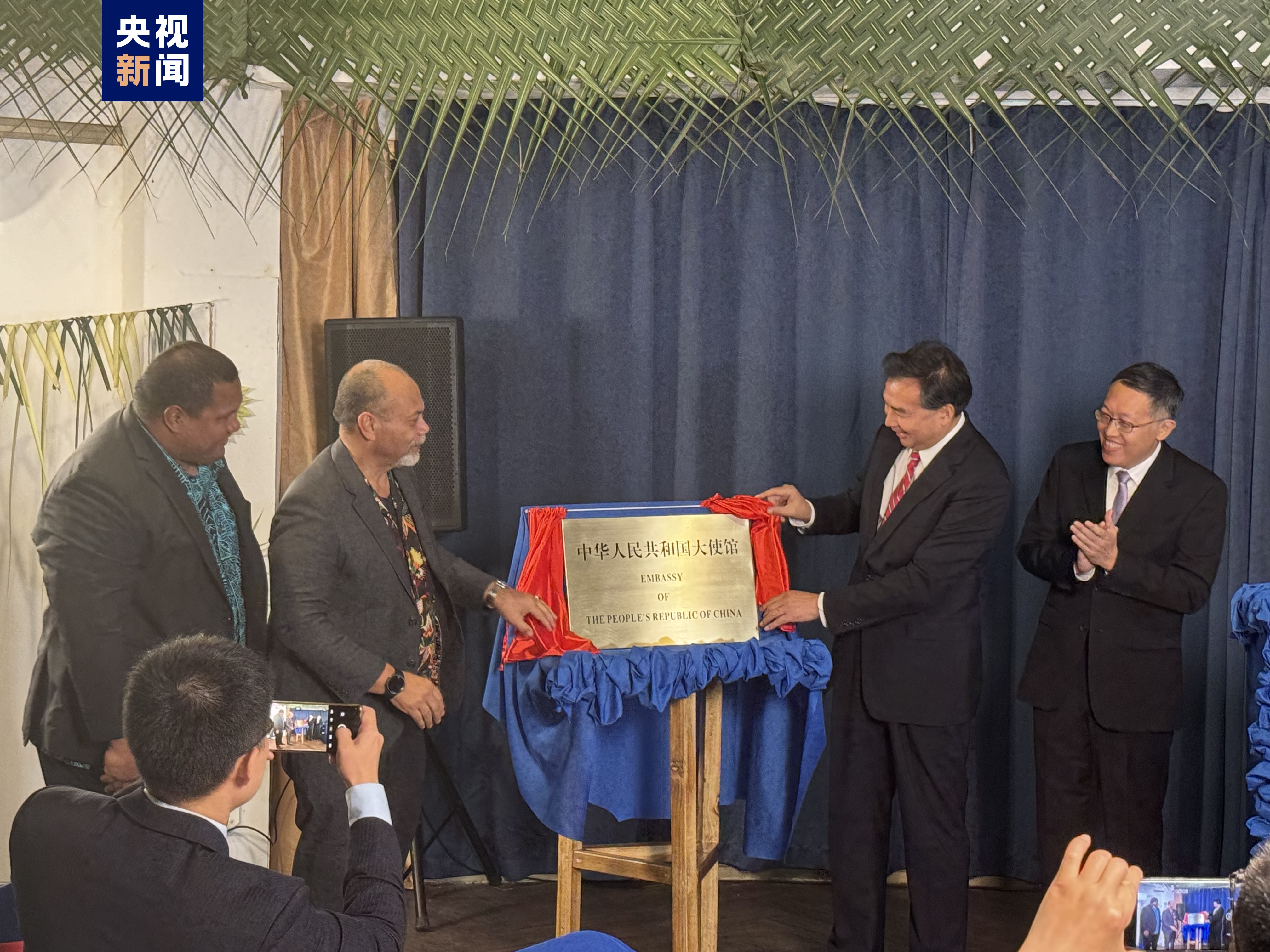 据央视新闻消息,当地时间1月29日,中华人民共和国驻瑙鲁共和国大使馆复馆仪式上,由中瑙两国政府代表共同为中国驻瑙鲁大使馆揭牌。(总台记者 王聪)