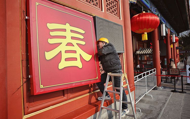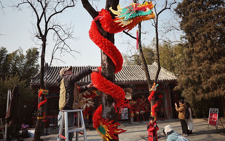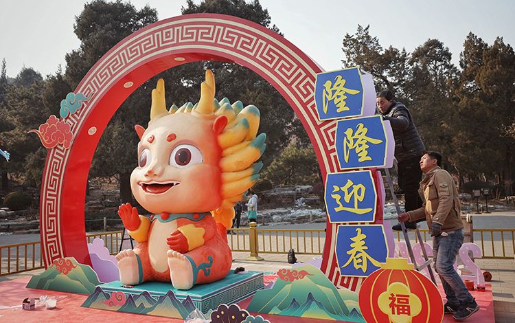 工作人员正在布置春节景观,景山公园东门以“隆隆迎春”为主题,结合市属公园龙年生肖IP形象、祥云、吉祥纹饰等传统元素,形成视觉冲击力强、观赏性佳的立体雕塑景观。