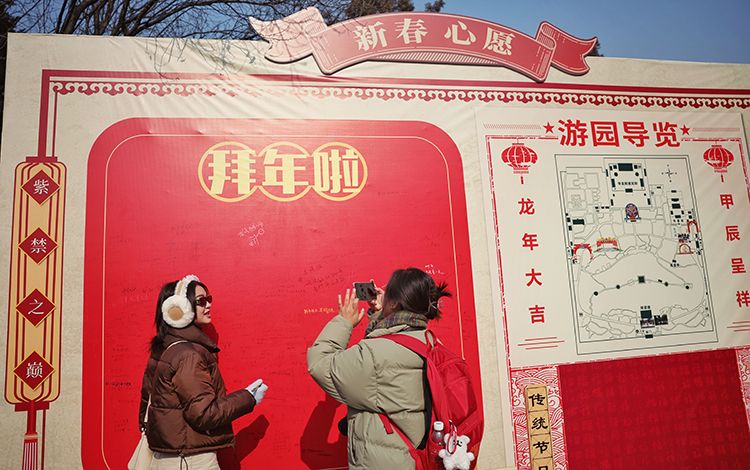 游客在“新春心愿墙”上写下新年祝福。