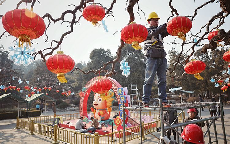 工作人员正在布置春节主题景观。