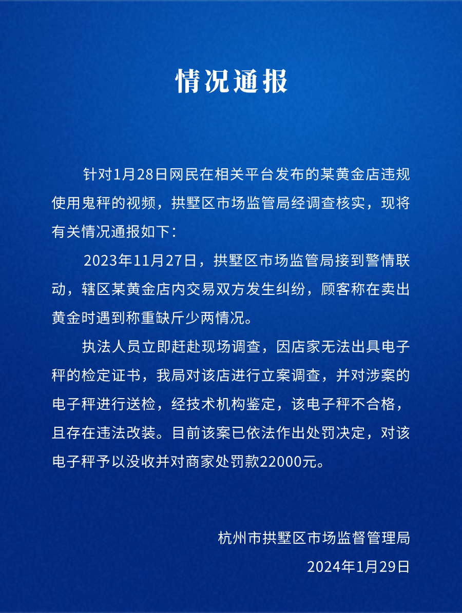 新京报讯 1月29日,拱墅市场监管局官微发布《关于网友发布“黄金店使用鬼秤”的调查情况通报》。其中提到,经鉴定,涉案的电子秤存在违法改装,该黄金店被处罚款22000元。全文如下: