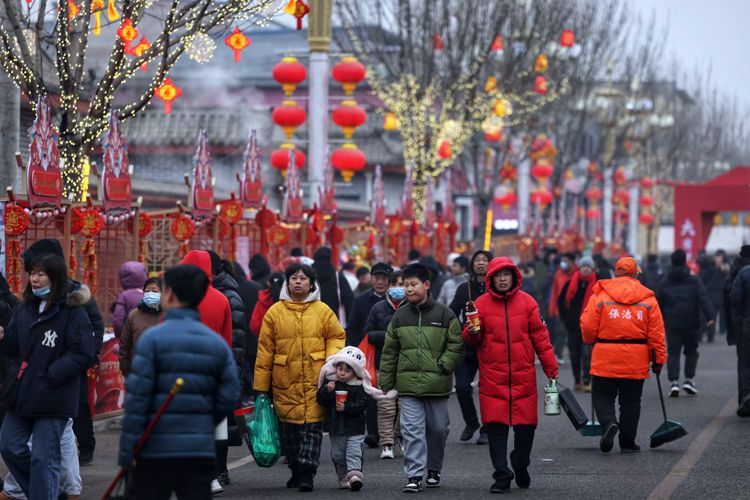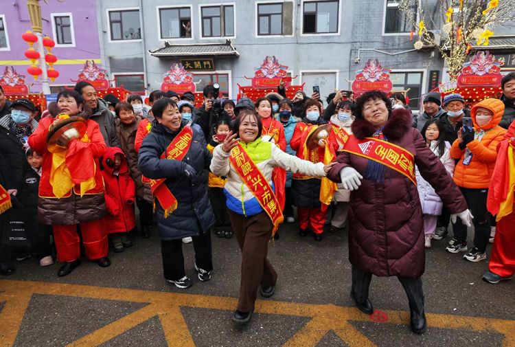 1月30日,2024年全国村晚“兴”市集在大兴区黄村镇三间房村开集。图为三间房村村民表演“武吵子”为开集助兴。