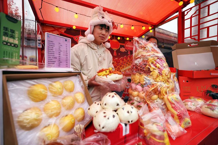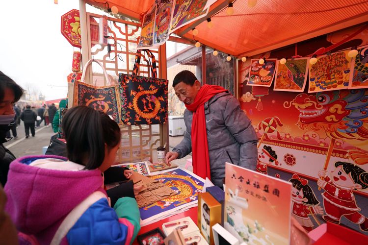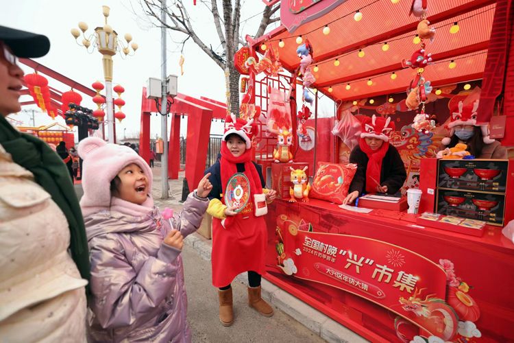 来自全国17个省份的600多种地方特色产品、文采超市推荐的文创产品、对口帮扶县名优农产品以及北京市大兴区特色好物亮相市集,赶集的市民可一站式买齐各类年货。图为小朋友购买文创产品。