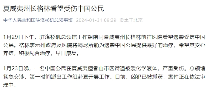 新京报讯 据中华人民共和国驻洛杉矶总领事馆消息,1月29日下午,驻洛杉矶总领馆工作组陪同夏威夷州长格林前往医院看望遇袭受伤中国公民。格林表示州政府及医院将竭尽所能为遇袭中国公民提供最好的治疗,希望其安心养伤,积极配合治疗,早日康复。