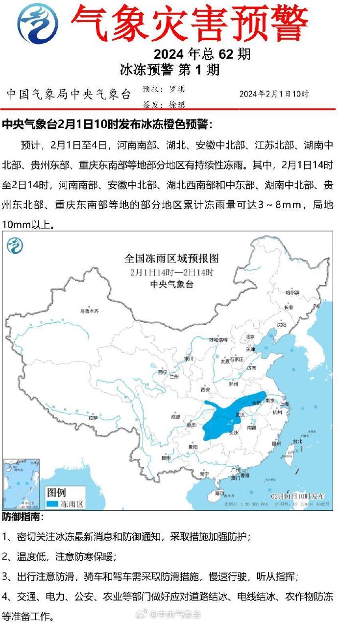 中央气象台发布冰冻橙色预警 河南、湖北等地部分地区有持续性冻雨