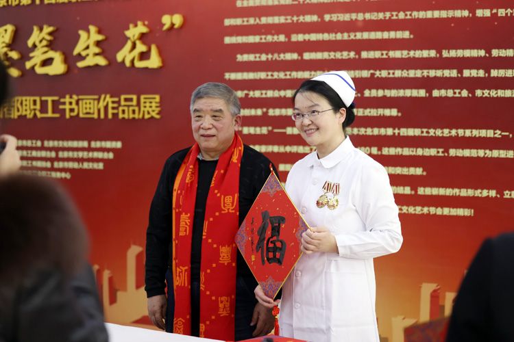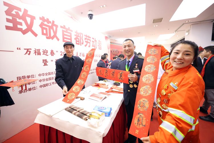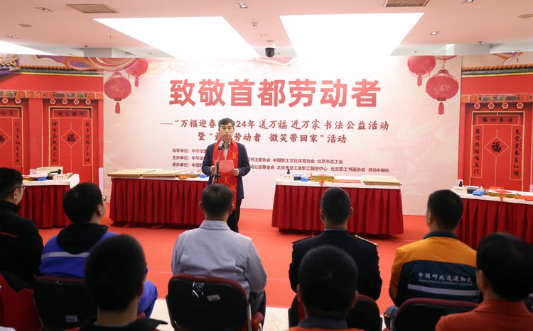 2月1日,致敬首都劳动者——“万福迎春”2024年送万福进万家书法公益活动暨“最美劳动者 微笑带回家”活动在北京市总工会职工服务中心举办。送万福进万家书法公益活动是深受职工群众喜爱的职工文化品牌。“最美劳动者、微笑带回家”活动是北京市总工会连续8年举办的“两节”送温暖品牌活动,通过向劳模工匠和一线职工代表赠送微笑照和“福”字,祝福首都劳动者开心过大年、劳动创未来。